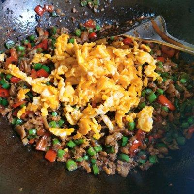8、最后起锅前,把鸡蛋碎倒进去。翻炒均匀,出锅。