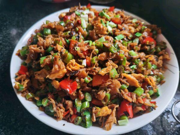 7、放外婆菜,翻炒,焖一会,烧干收汁。