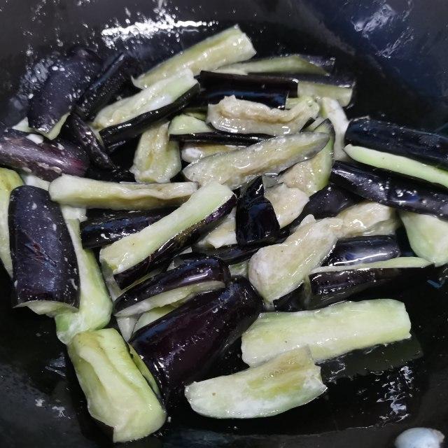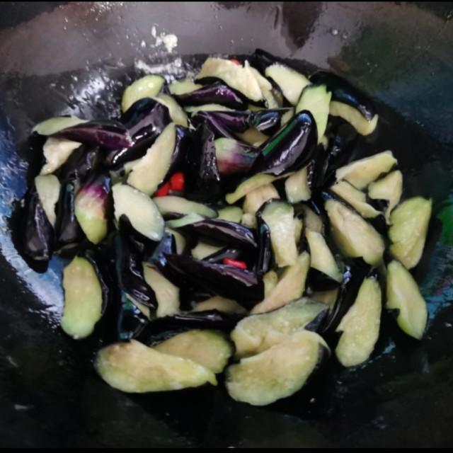 第8步、锅里油烧热倒入茄子炒至疲软。