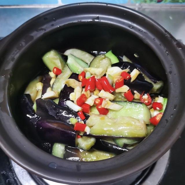 原料:茄子、蒜粒、葱花、小米椒、盐、生抽、蚝油、白糖。