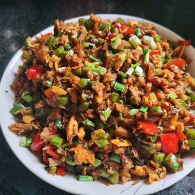 8、最后起锅前,把鸡蛋碎倒进去。翻炒均匀,出锅。