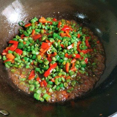 6、炒完鸡蛋后,倒入油,放四季豆、青红椒,翻炒一会。倒入生抽、少许盐、老抽,继续翻炒,再导入适量清水。