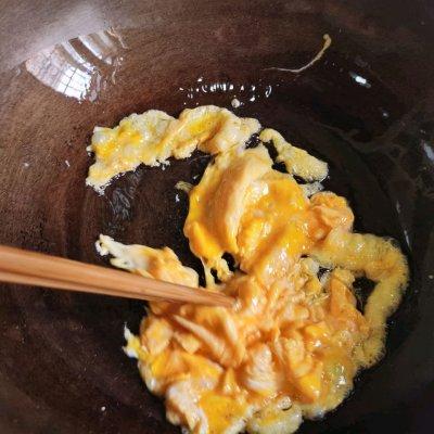 5、先少油炒鸡蛋,成型后筷子划碎,起锅备用。