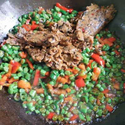7、放外婆菜,翻炒,焖一会,烧干收汁。