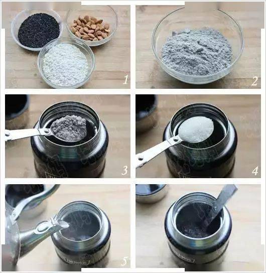 原料:黑芝麻30克、杏仁30克、糯米40克、白糖一勺