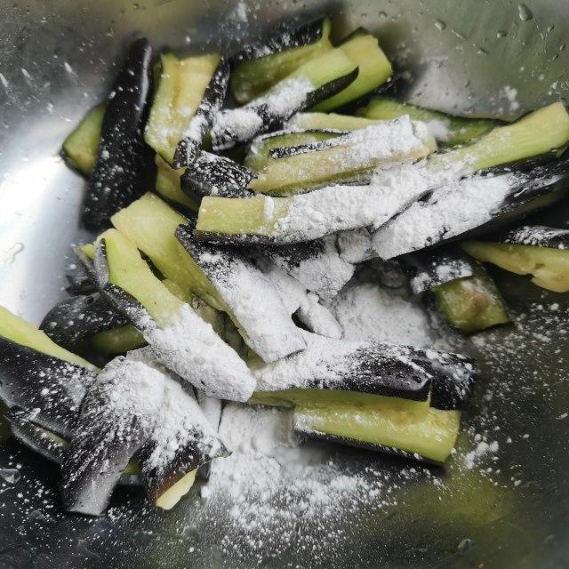 第8步、锅里油烧热倒入茄子炒至疲软。